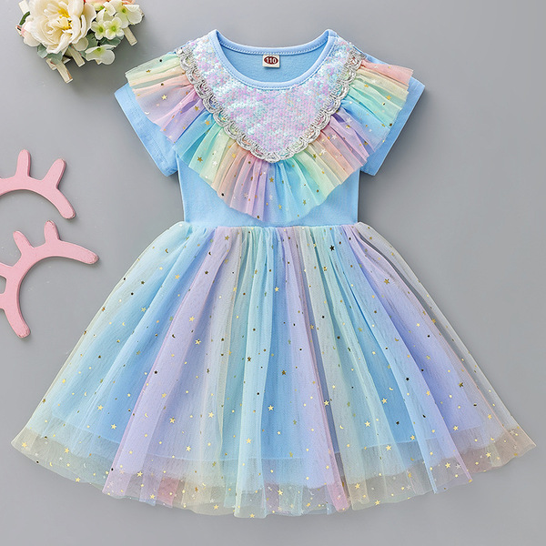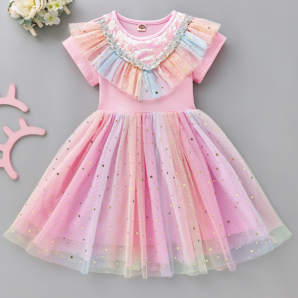 Princess Dress Girls Autum Style Rainbow Short Sleeve