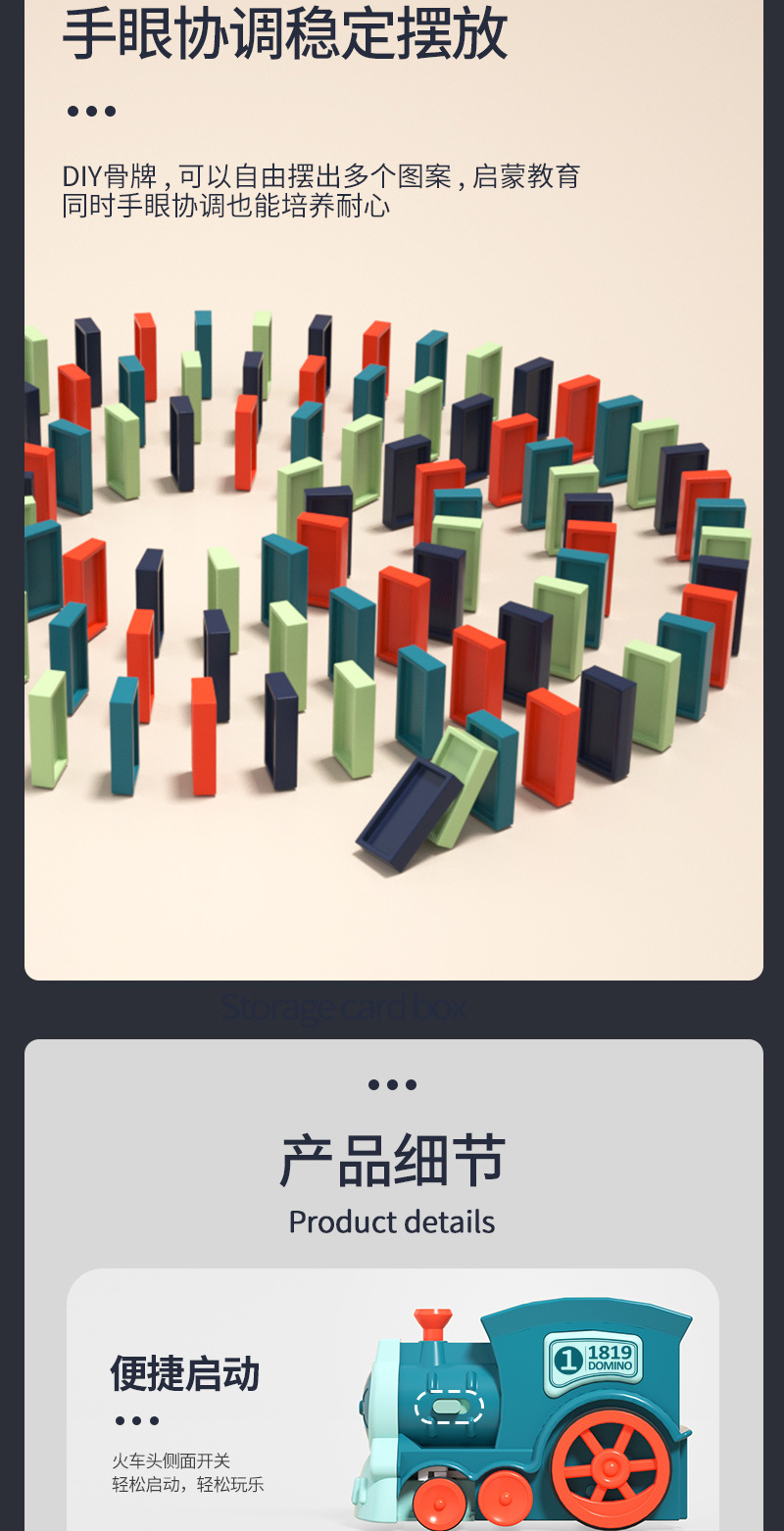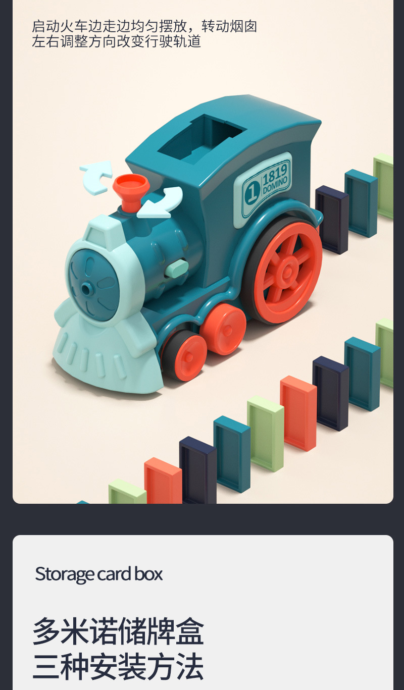 These toys are electric toy trains that automatically drop domino pieces as they move. Kid loads colorful plastic domino blocks into a cartridge or hopper on the train, switches it on, and the train travels forward while placing domino pieces in a neat line. Once the domino line is down, you (or your child) can push the first piece to watch a domino cascade