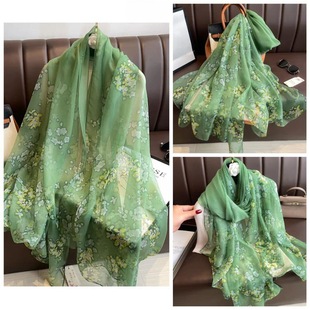 Elegant Green Transparent Thin Silk Printing Long Scarf